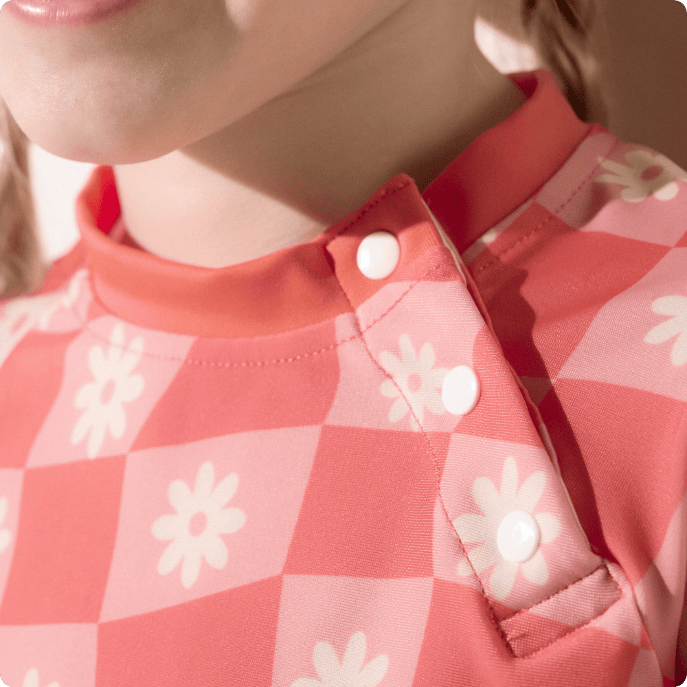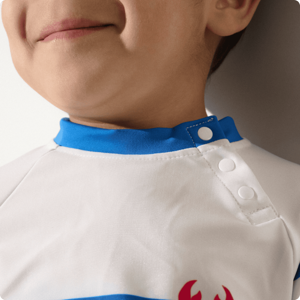 Nuestra camiseta infantil anti-UV se distingue por sus 3 botones a presión que permiten ponerla y quitarla sin esfuerzo. Su tejido es elástico y fresco, para una comodidad óptima y suave para la piel sensible de su hijo .