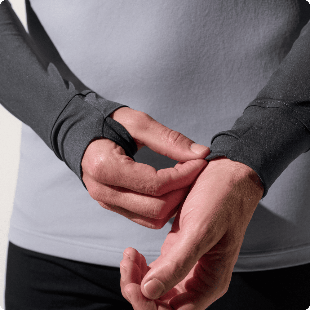 - Orificio para el pulgar para proteger las manos de los rayos UV en caso necesario. La manga está diseñada de tal forma que resulta muy discreta cuando no se utiliza.